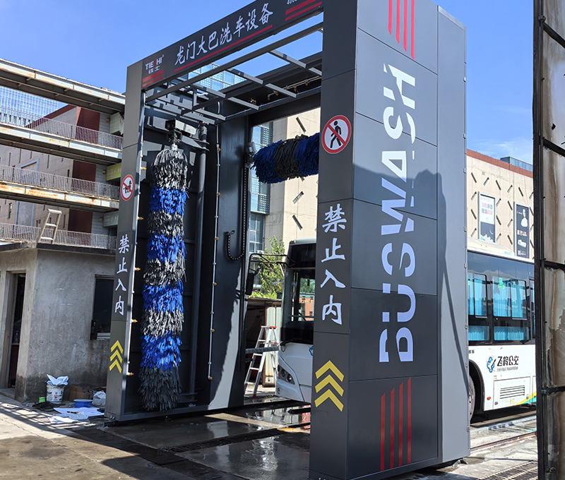 鐵士大型移動式洗車機(jī),適用于清洗大型客車外表面的灰塵、油污及其它污漬。通過水、清洗劑及清洗刷的作用自動清洗車輛的車頭、兩側(cè)、車尾及車頂,洗車機(jī)由移動式刷洗系統(tǒng)、電控系統(tǒng)、水供給系統(tǒng)、洗滌劑供給系統(tǒng)等組成,并可配置污水循環(huán)處理系統(tǒng)。當(dāng)車輛至清洗區(qū)指定位置停止后,洗車機(jī)在行走軌道上運(yùn)動,自動進(jìn)行洗滌劑噴灑,車頭、兩側(cè)、車尾及車頂?shù)乃⑾春蜎_洗工作,清洗后車體外表面無灰塵、泥土和其它附著物。